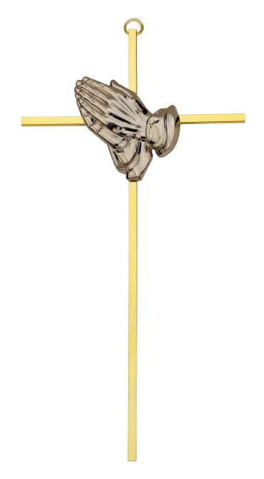 The cross is elegantly gold-plated and meticulously polished on all four sides, with a silver-tone praying hands that enhances depth and dimension in the design. Individually Boxed. The gold-plated cross has a slim profile, measuring approximately 5-Inch x 10-Inch, and is solid at 3/16-Inch Square.