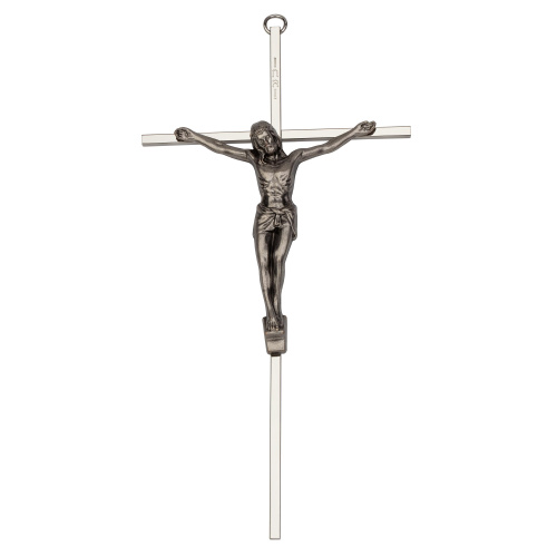 The crucifix is elegantly silver-plated and meticulously polished on all four sides, with an antiqued silver-tone corpus that enhances depth and dimension in the design. To ensure lasting beauty, it is finished with a protective lacquer and a rich patina. Each piece comes individually boxed. The metal crucifix features a slim profile, measuring approximately 5-Inch x 10-Inch, and is solid at 3/16-Inch square.