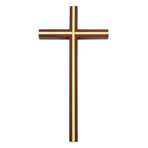 The cross is crafted from wood with a rich walnut finish and features a gold-plated inlay cross. Each piece comes individually boxed. The wood cross features a slim profile, measuring approximately 5-Inch x 10-Inch, and is solid at 3/16 in square.