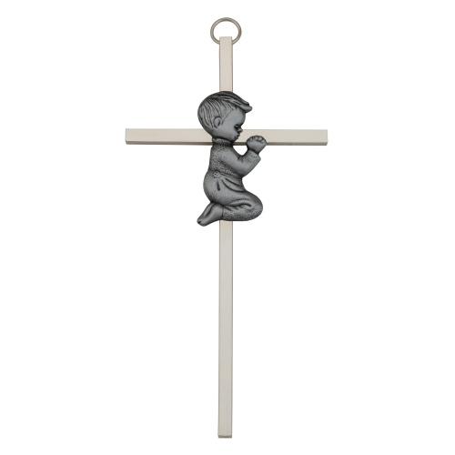 The cross is elegantly silver-plated and meticulously polished on all four sides, with an silver-tone kneeling praying boy that enhances depth and dimension in the design. Individually Boxed. The silver-plated cross has a slim profile, measuring approximately 3-Inch x 7-Inch.
