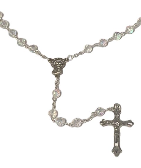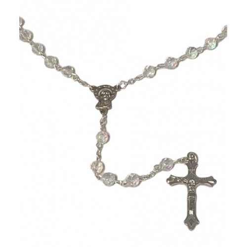Clear Aurora Borealis Crystal Rosary 6 mm 19.5 inch Silver Linked Chain