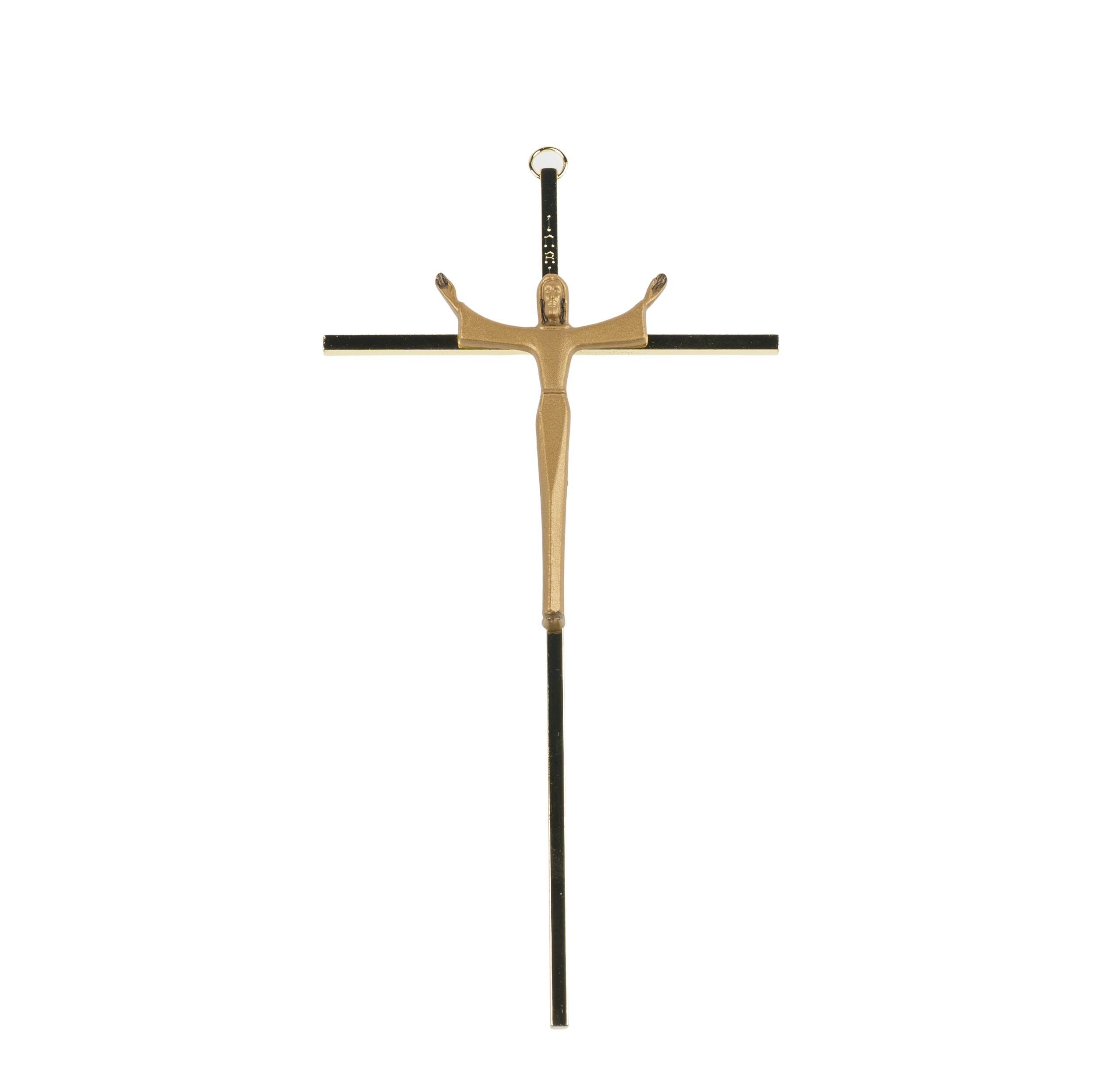 The cross is elegantly gold-plated and meticulously polished on all four sides, with an antiqued modern bronze Risen Christ that enhances depth and dimension in the design. To ensure lasting beauty, it is finished with a protective lacquer and a rich patina. Individually Boxed. The gold-plated cross has a slim profile, measuring approximately 5-Inch x 10-Inch, and is solid at 3/16-Inch Square.