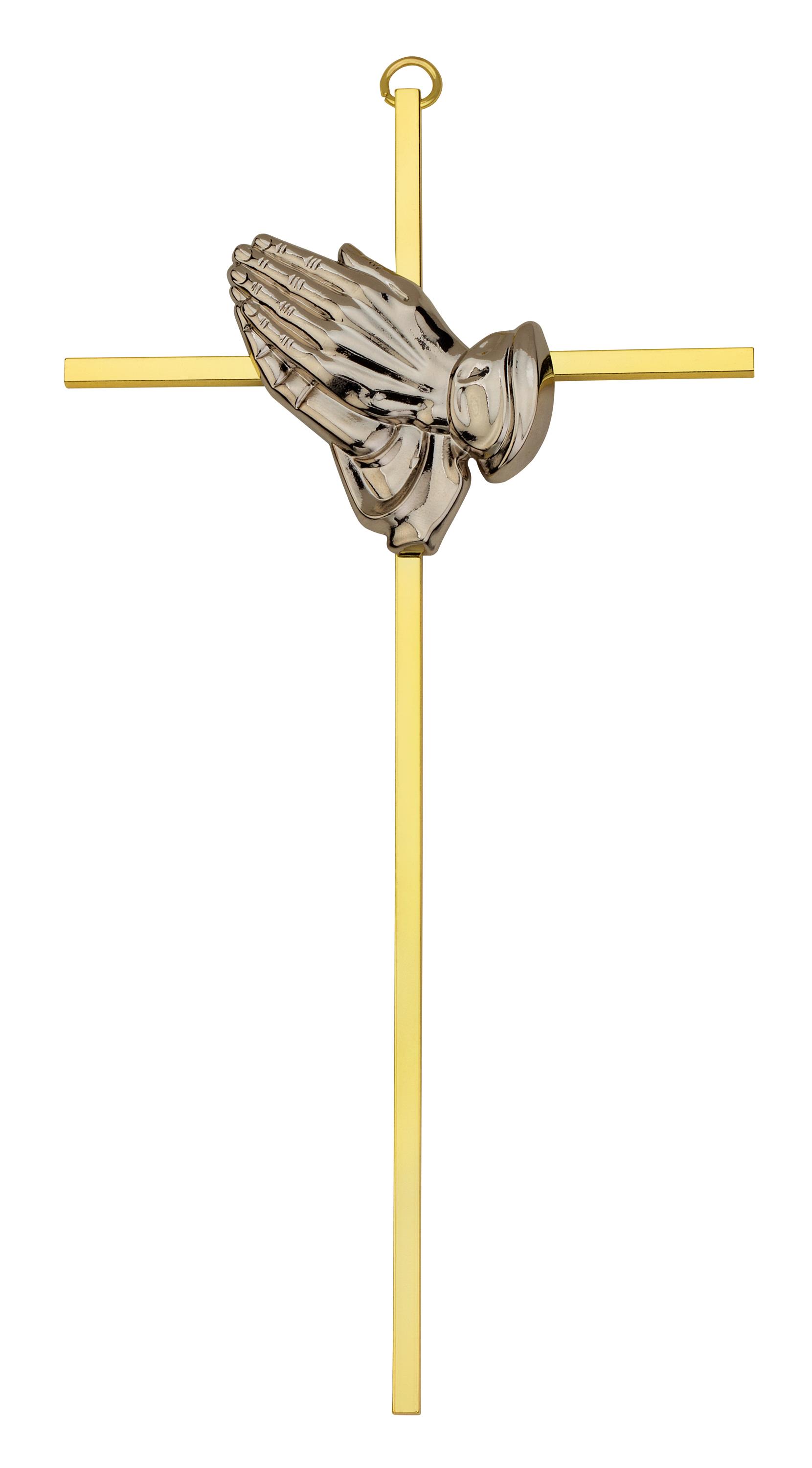 The cross is elegantly gold-plated and meticulously polished on all four sides, with a silver-tone praying hands that enhances depth and dimension in the design. Individually Boxed. The gold-plated cross has a slim profile, measuring approximately 5-Inch x 10-Inch, and is solid at 3/16-Inch Square.