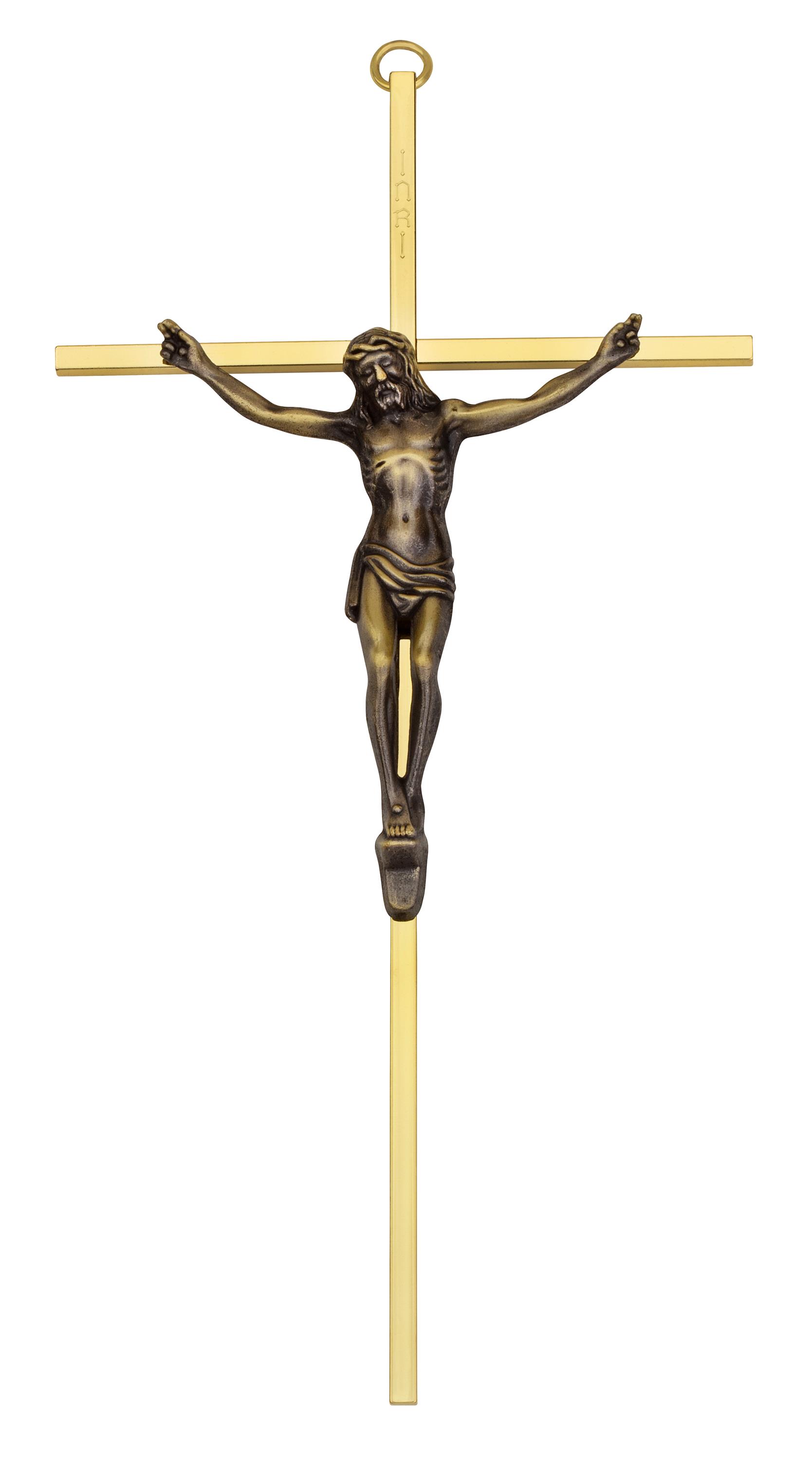 The crucifix is elegantly gold-plated and meticulously polished on all four sides, with an antiqued bronze corpus that enhances depth and dimension in the design. To ensure lasting beauty, it is finished with a protective lacquer and a rich patina. Each piece comes individually boxed. The gold-plated features a slim profile, measuring approximately 5-Inch x 10-Inch, and is solid at 3/16 -Inch square.