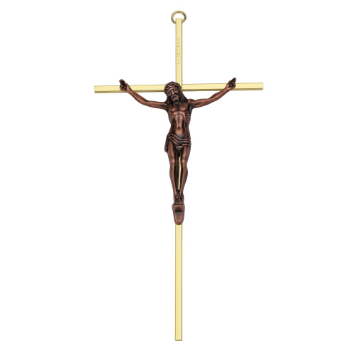 The crucifix is elegantly gold-plated and meticulously polished on all four sides, with a copper corpus that enhances depth and dimension in the design. To ensure lasting beauty, it is finished with a protective lacquer and a rich patina. Each piece comes individually boxed. The gold-plated crucifix features a slim profile, measuring approximately 5-Inch x 10-Inch, and is solid at 3/16 -Inch square.