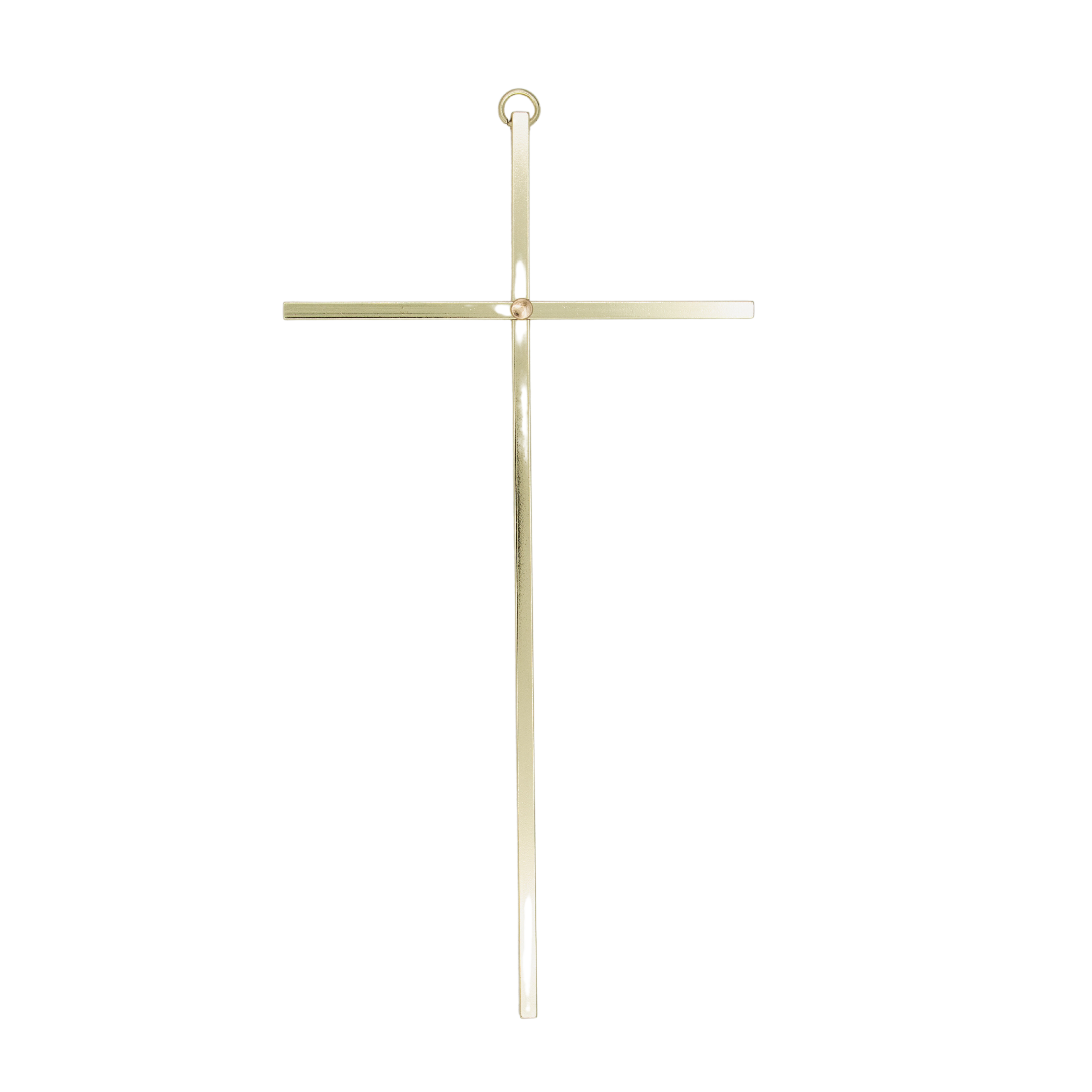 The cross is elegantly gold-plated and meticulously polished on all four sides. Individually Boxed. The gold-plated cross has a slim profile, measuring approximately 5-Inch x 10-Inch, and is solid at 3/16-Inch Square.