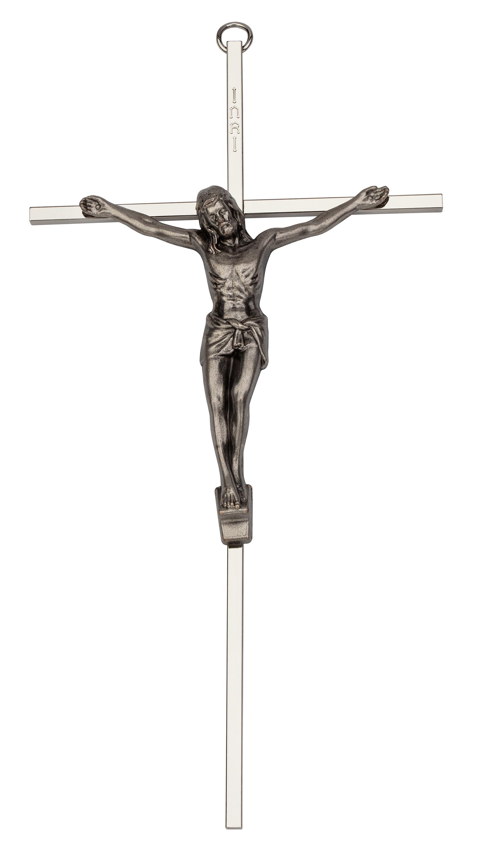 The crucifix is elegantly silver-plated and meticulously polished on all four sides, with an antiqued silver-tone corpus that enhances depth and dimension in the design. To ensure lasting beauty, it is finished with a protective lacquer and a rich patina. Each piece comes individually boxed. The metal crucifix features a slim profile, measuring approximately 5-Inch x 10-Inch, and is solid at 3/16-Inch square.