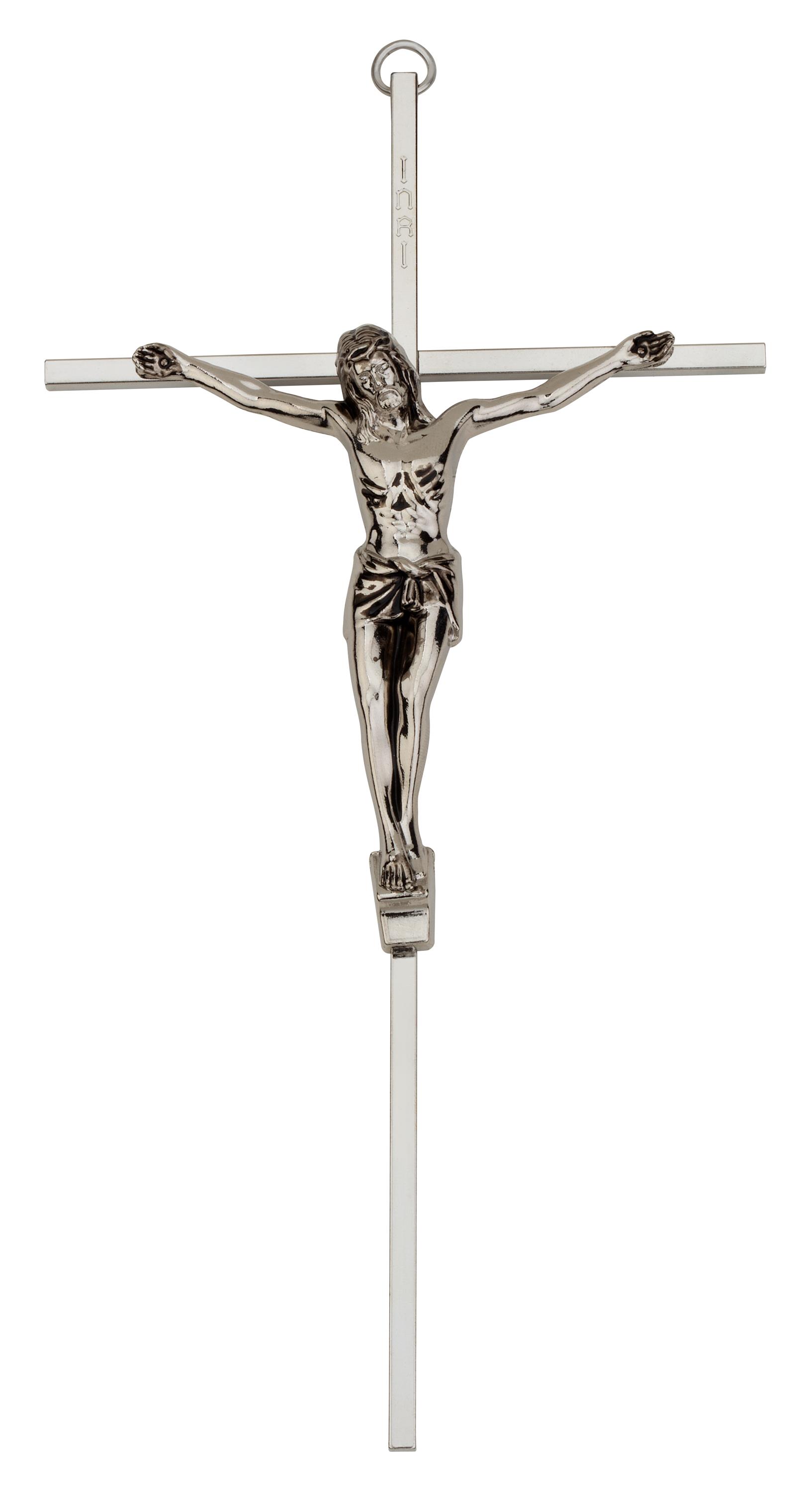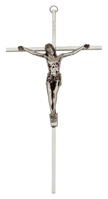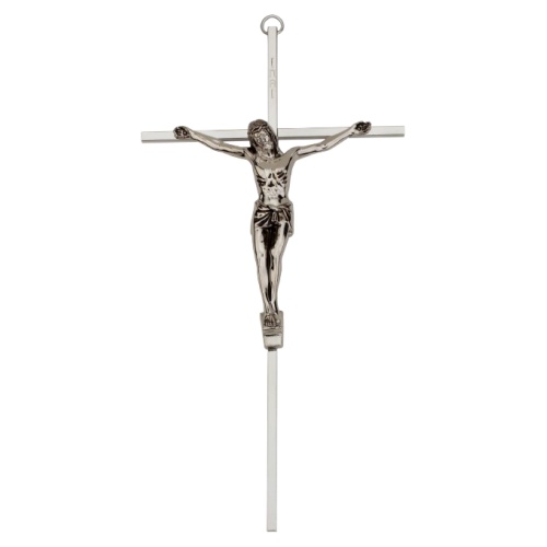 The crucifix is elegantly silver-plated and meticulously polished on all four sides, with a silver-tone corpus that enhances depth and dimension in the design. To ensure lasting beauty, it is finished with a protective lacquer and a rich patina. Each piece comes individually boxed. The silver-plated crucifix features a slim profile, measuring approximately 5-Inch x 10 -Inch, and is solid at 3/16 -Inch square.
