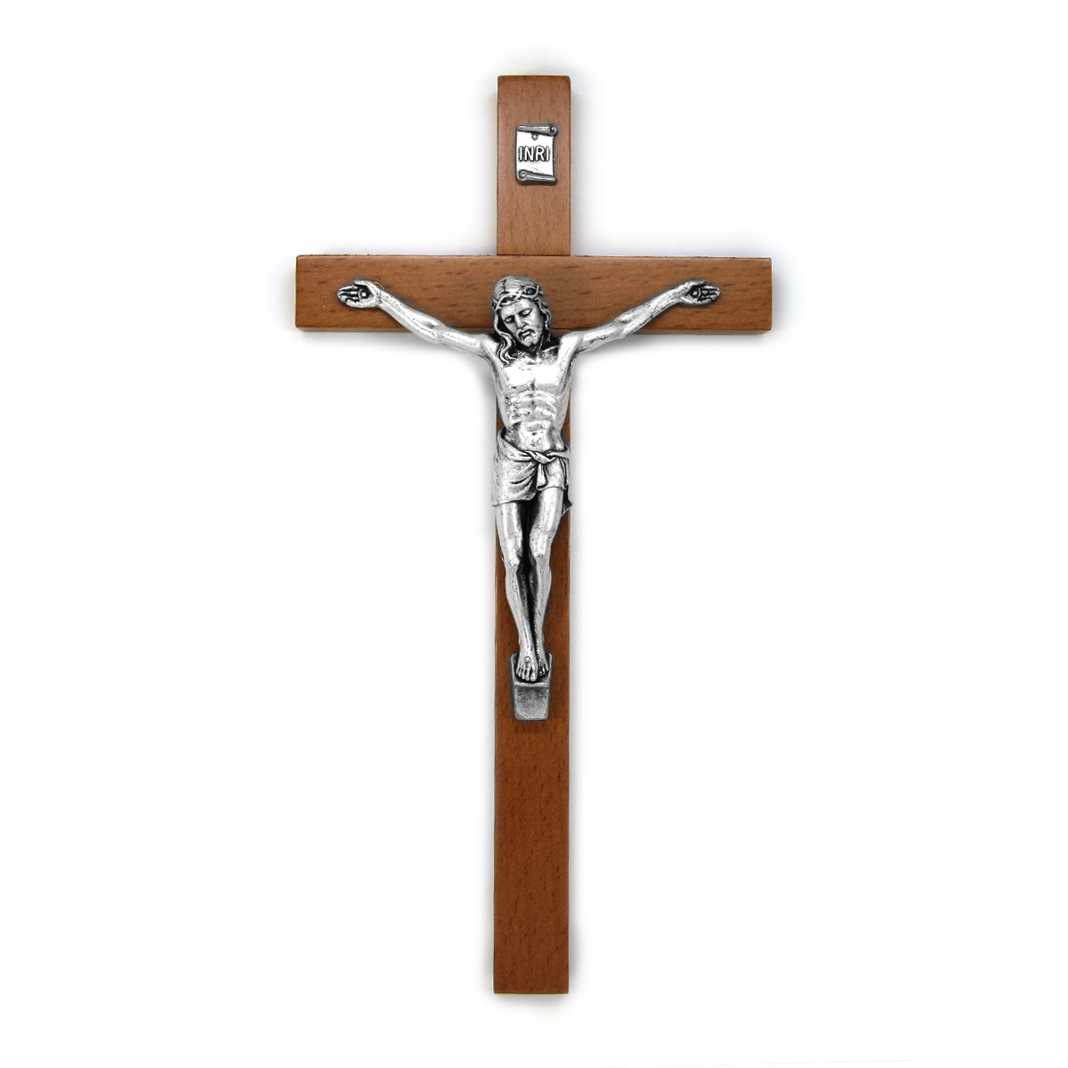 The crucifix is crafted from wood with a rich finish and features a Antique Silver-Tone Corpus that enhances depth and dimension in the design. To ensure lasting beauty, it is finished with a protective lacquer and a rich patina. Individually Boxed. Measuring approximately 5-Inch x 10-Inch.