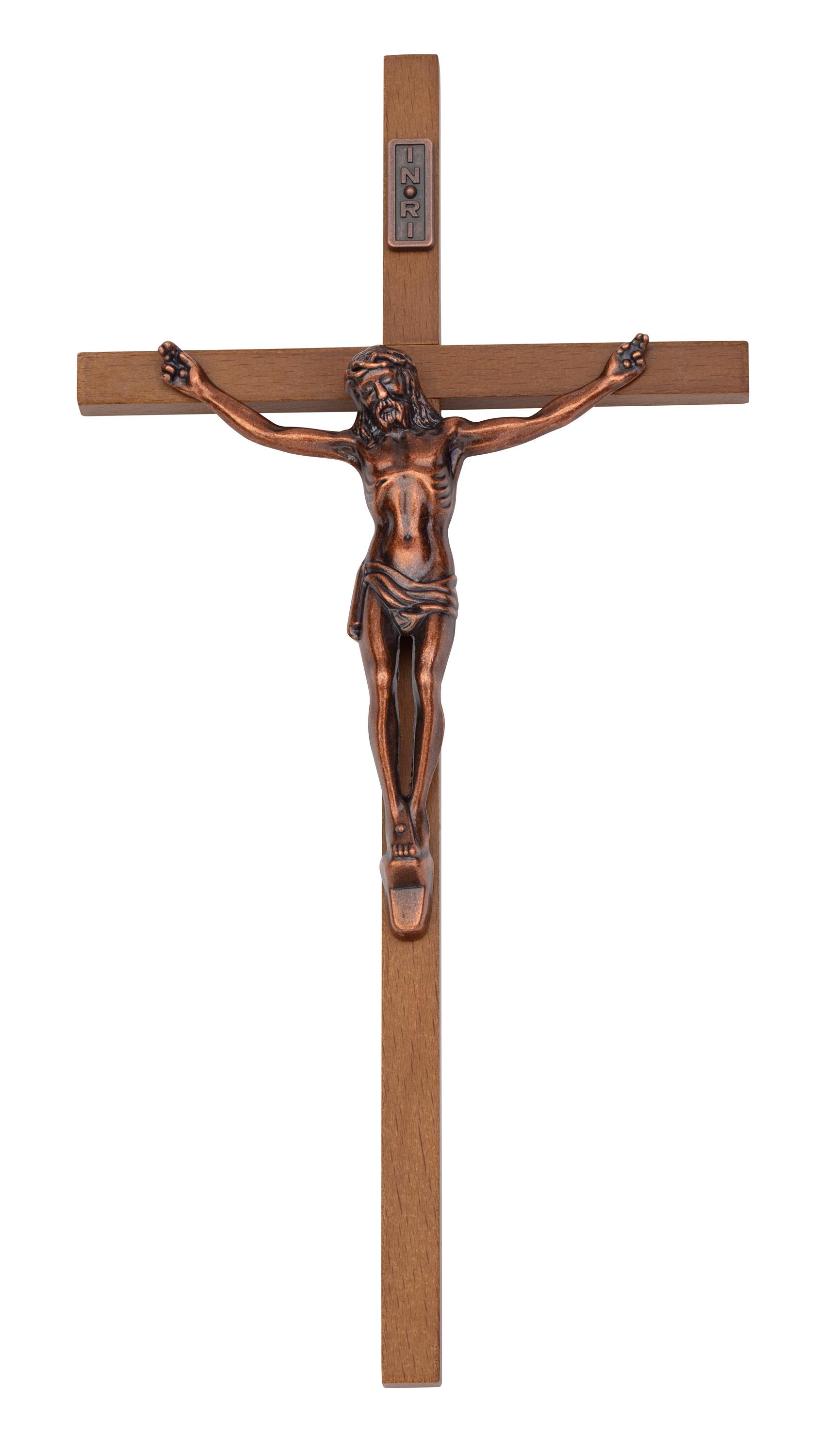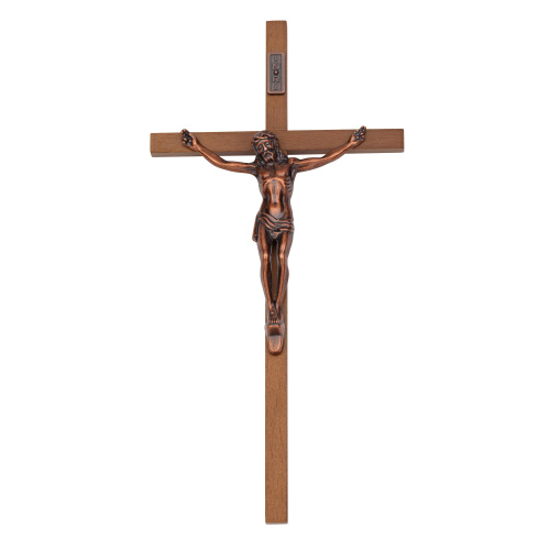 The crucifix is crafted from wood with a rich walnut finish and features a Copper Corpus that enhances depth and dimension in the design. To ensure lasting beauty, it is finished with a protective lacquer and a rich patina. Individually Boxed. Measuring approximately 5-Inch x 10-Inch