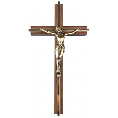 The crucifix is crafted from wood with a rich walnut finish with gold-plated metal extended inlay and features a Bronze Corpus that enhances depth and dimension in the design. To ensure lasting beauty, it is finished with a protective lacquer and a rich patina. Individually Boxed. Measuring approximately 5-Inch x 10-Inches