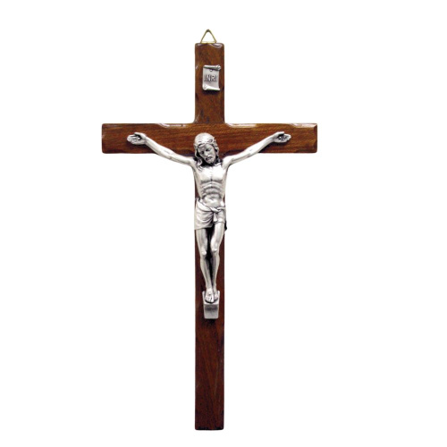 The crucifix is crafted from wood with a rich finish and features a silver-tone corpus that adds depth and dimension to the design. To ensure lasting beauty, it is coated with a protective lacquer and finished with a rich patina. Each piece comes individually boxed and measures approximately 5-Inchs by 10-Inch.