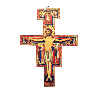 This stunning wooden San Damiano crucifix feature a rich, intricate design, showcasing revered Christian icons. The beautifully crafted crucifix is adorned with sacred images of key religious figures, including Christ, and various saints, making it not only a religious symbol but also a piece of sacred art. Its detailed iconography and vintage-style finish create a spiritual ambiance for your home, church, or personal altar.