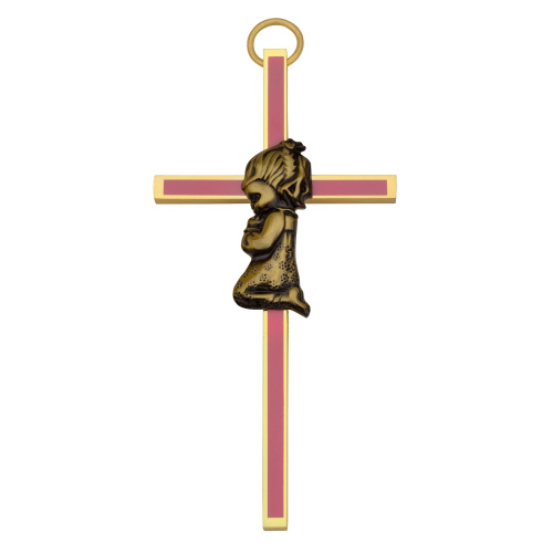 The cross is elegantly gold-plated with pink inlay and meticulously polished on all four sides, with a gold-tone kneeling praying girl that enhances depth and dimension in the design. Individually Boxed. The gold-plated cross has a slim profile, measuring approximately 2-Inch x 4-Inch.