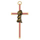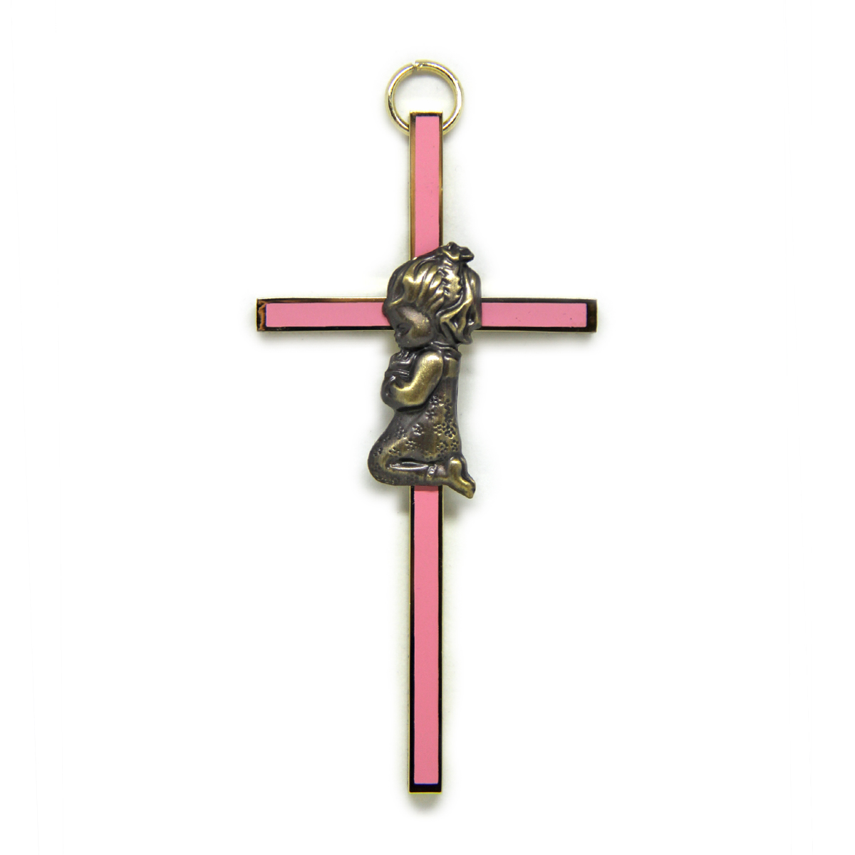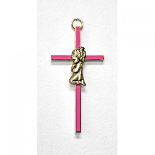 The cross is elegantly gold-plated with pink inlay and meticulously polished on all four sides, with a gold-tone kneeling praying girl that enhances depth and dimension in the design. Individually Boxed. The gold-plated cross has a slim profile, measuring approximately 2-Inch x 4-Inch.