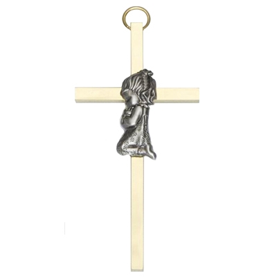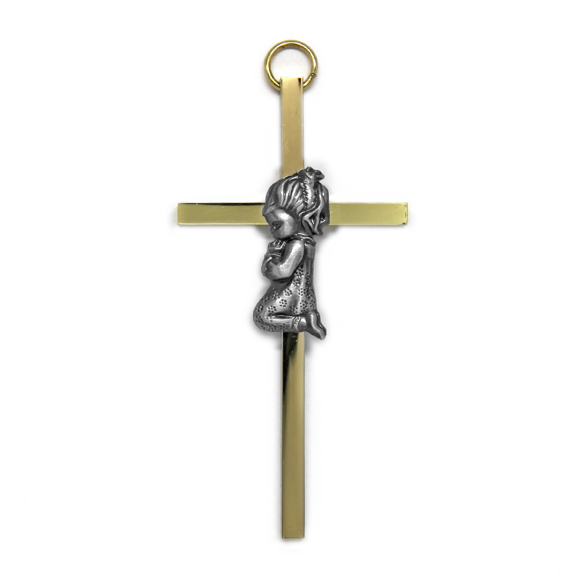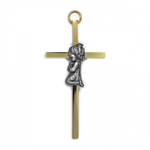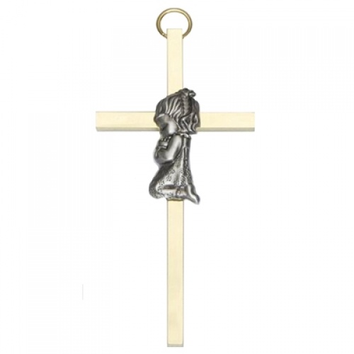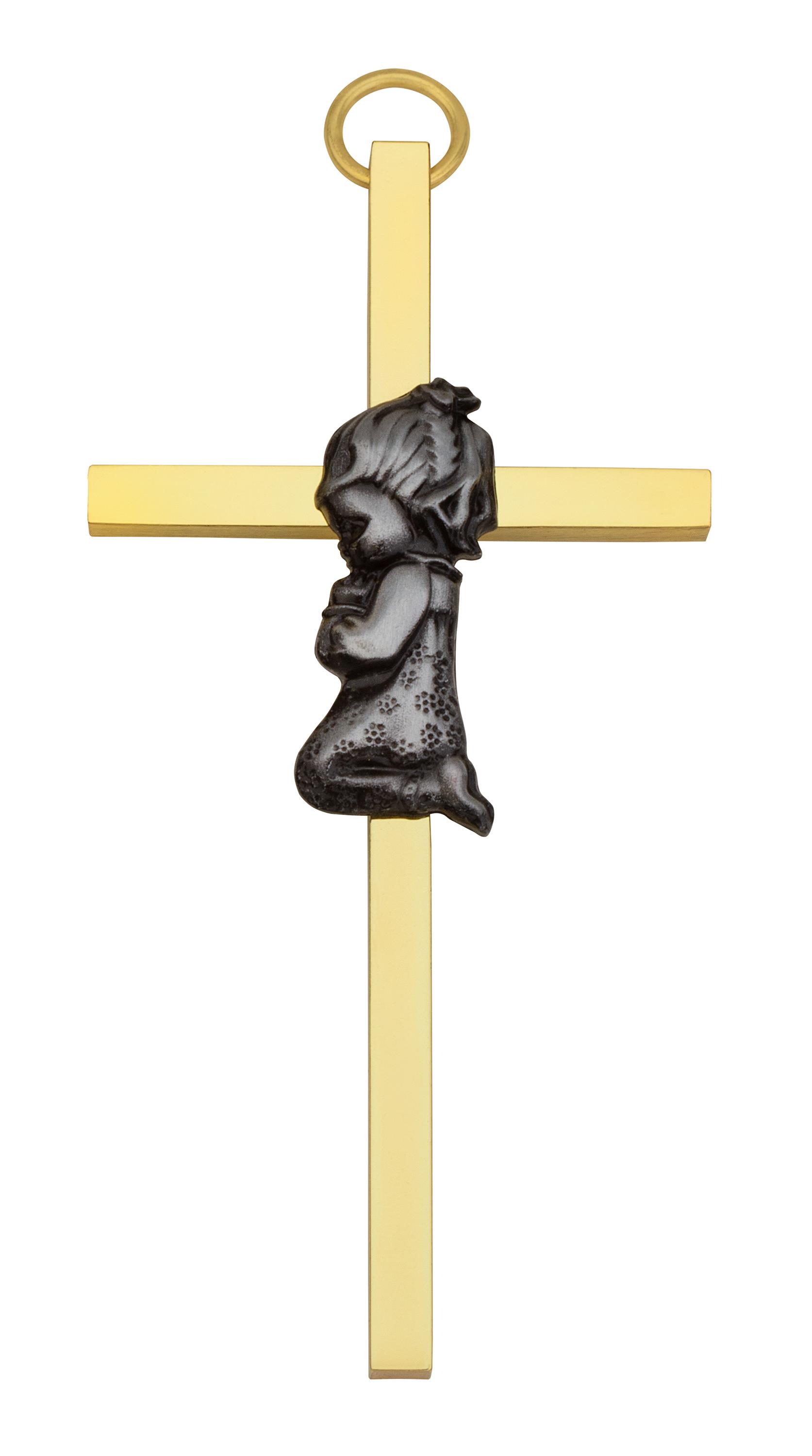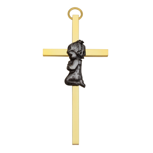 The cross is elegantly gold-plated and meticulously polished on all four sides, with an silver-tone kneeling praying girl that enhances depth and dimension in the design. Individually Boxed. The gold-plated cross has a slim profile, measuring approximately 2-Inch x 4-Inch.