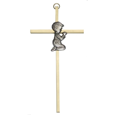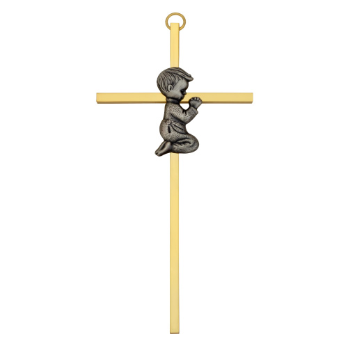 The cross is elegantly gold-plated and meticulously polished on all four sides, with an silver-tone kneeling praying boy that enhances depth and dimension in the design. Individually Boxed. The gold-plated cross has a slim profile, measuring approximately 2-Inch x 7-Inch.
