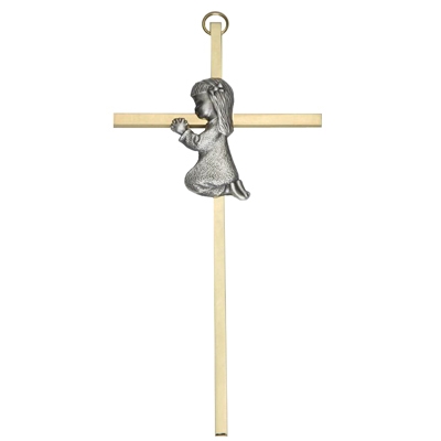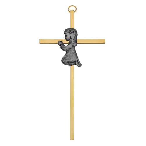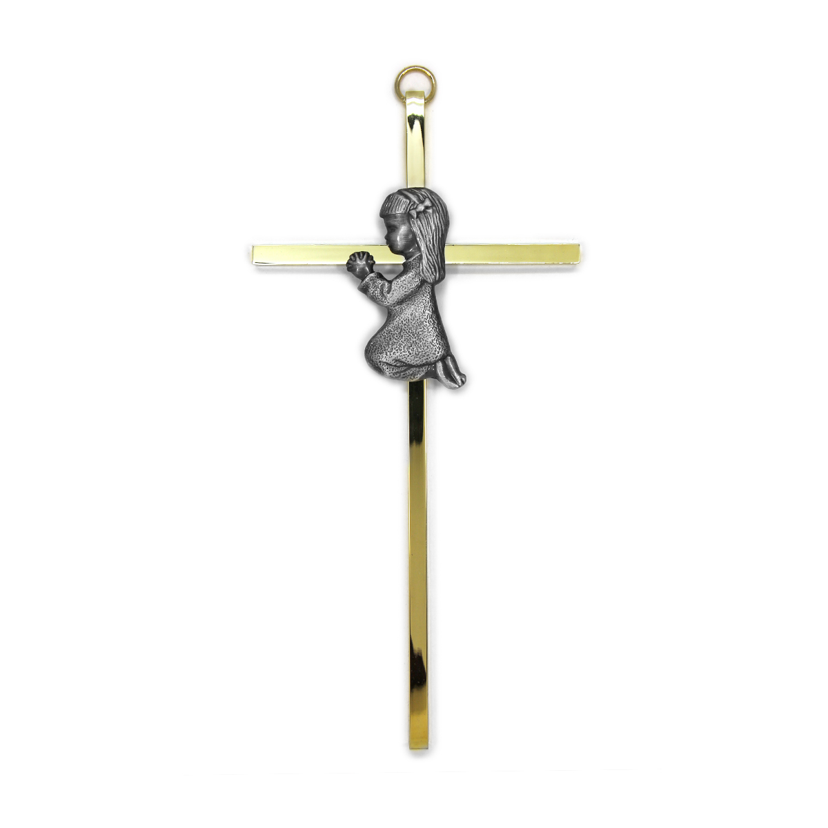 The cross is elegantly gold-plated and meticulously polished on all four sides, with an silver-tone kneeling praying girl that enhances depth and dimension in the design. Individually Boxed. The gold-plated cross has a slim profile, measuring approximately 2-Inch x 7-Inch.