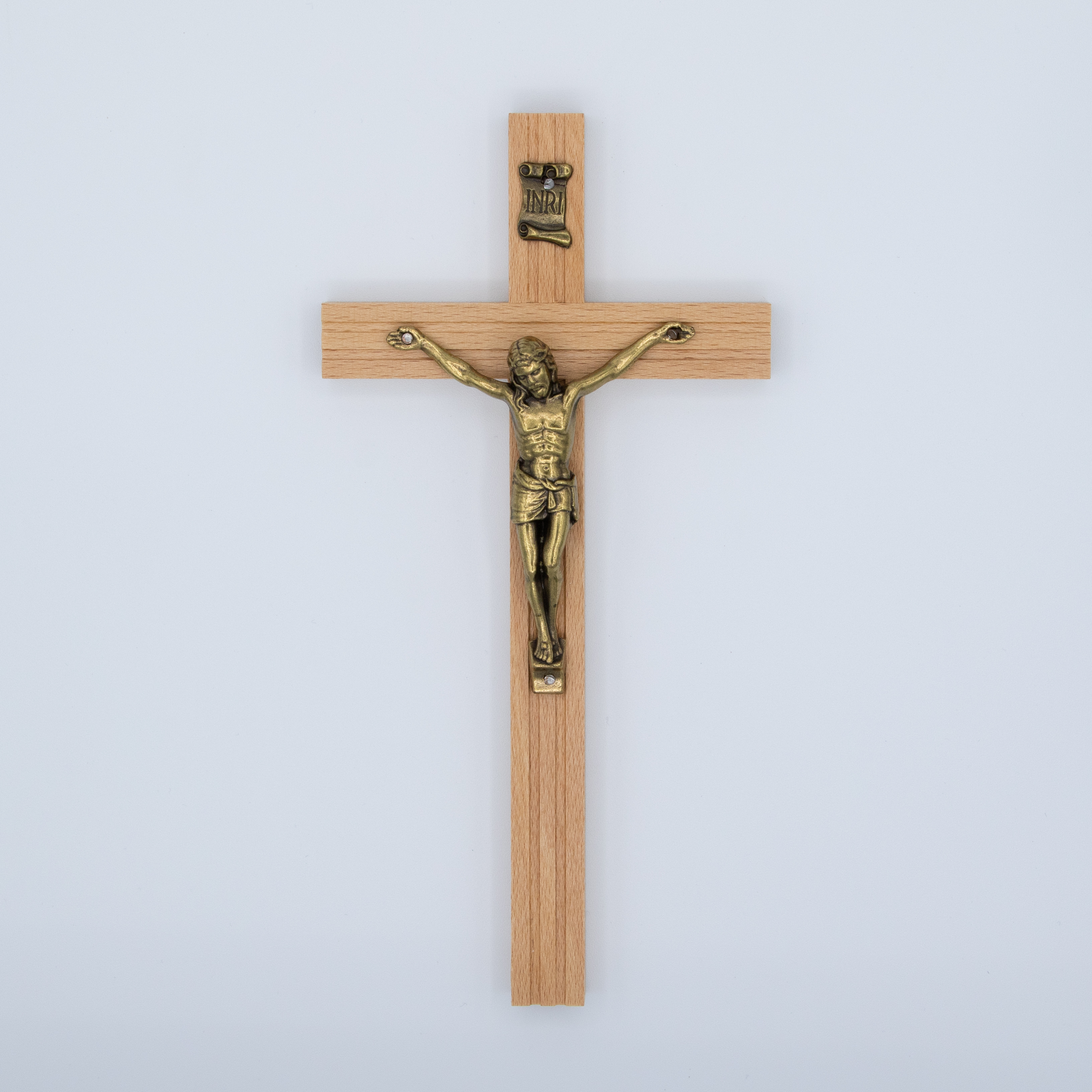 The crucifix is crafted from wood with a rich finish and features a Bronze Corpus that enhances depth and dimension in the design. To ensure lasting beauty, it is finished with a protective lacquer and a rich patina. Individually Boxed. Measuring approximately 5-Inch x 8.25-Inch
