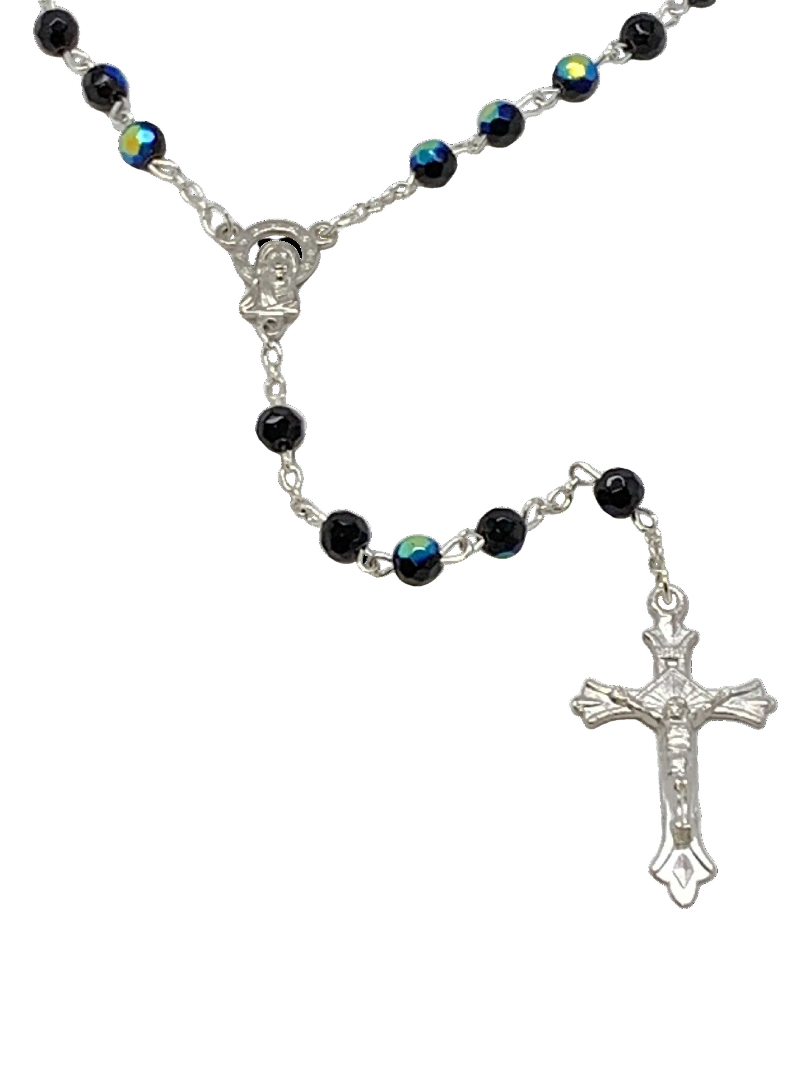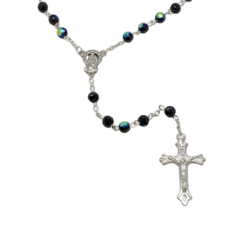 Black Aurora Borealis Crystal Rosary 6 mm 19.5 inch Silver Linked Chain