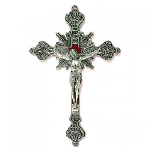 Crucifix for Wall, Silver Tone with Red Inlay, 8" with Box
