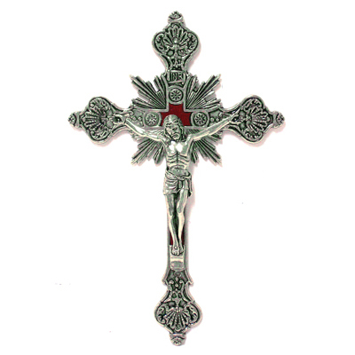 CRUCIFIX WALL SILVER TONE W RED INLAY 8"