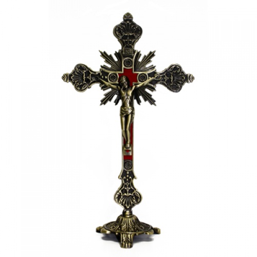 CRUCIFIX WITH BASE BRONZE TONE W RED INLAY 9 INCH