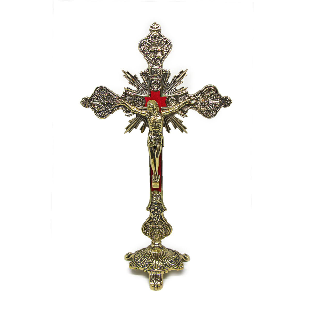 CRUCIFIX WITH BASE GOLD TONE W RED INLAY 12-INCH
