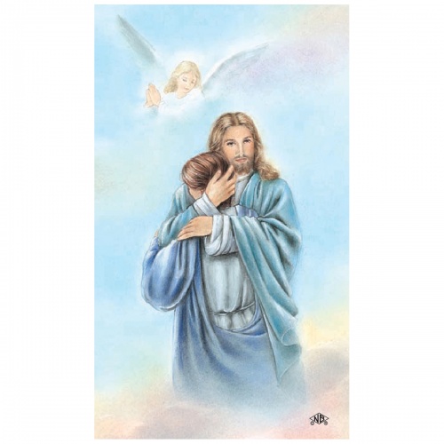 Size: 8-1/2 in x 11 in sheets with a 1 in left tab (not shown), separating into individual 2-1/2 in x 4-1/4 in cards. Each sheet contains 8 prayer cards and is compatible with laser printers and photocopiers.