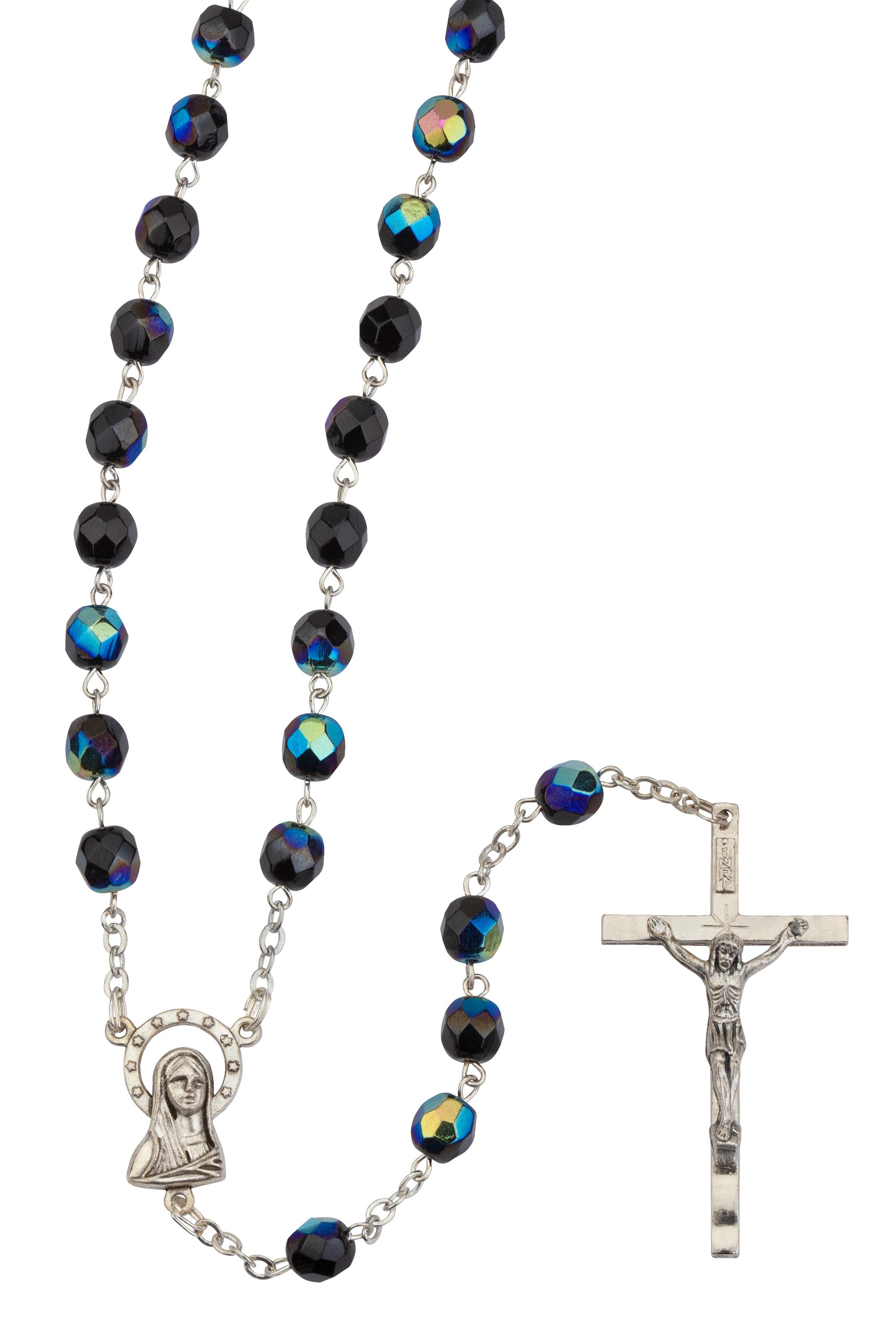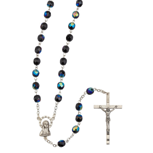 Black Aurora Borealis Crystal Rosary 6 mm 19.5 inch Silver Linked Chain