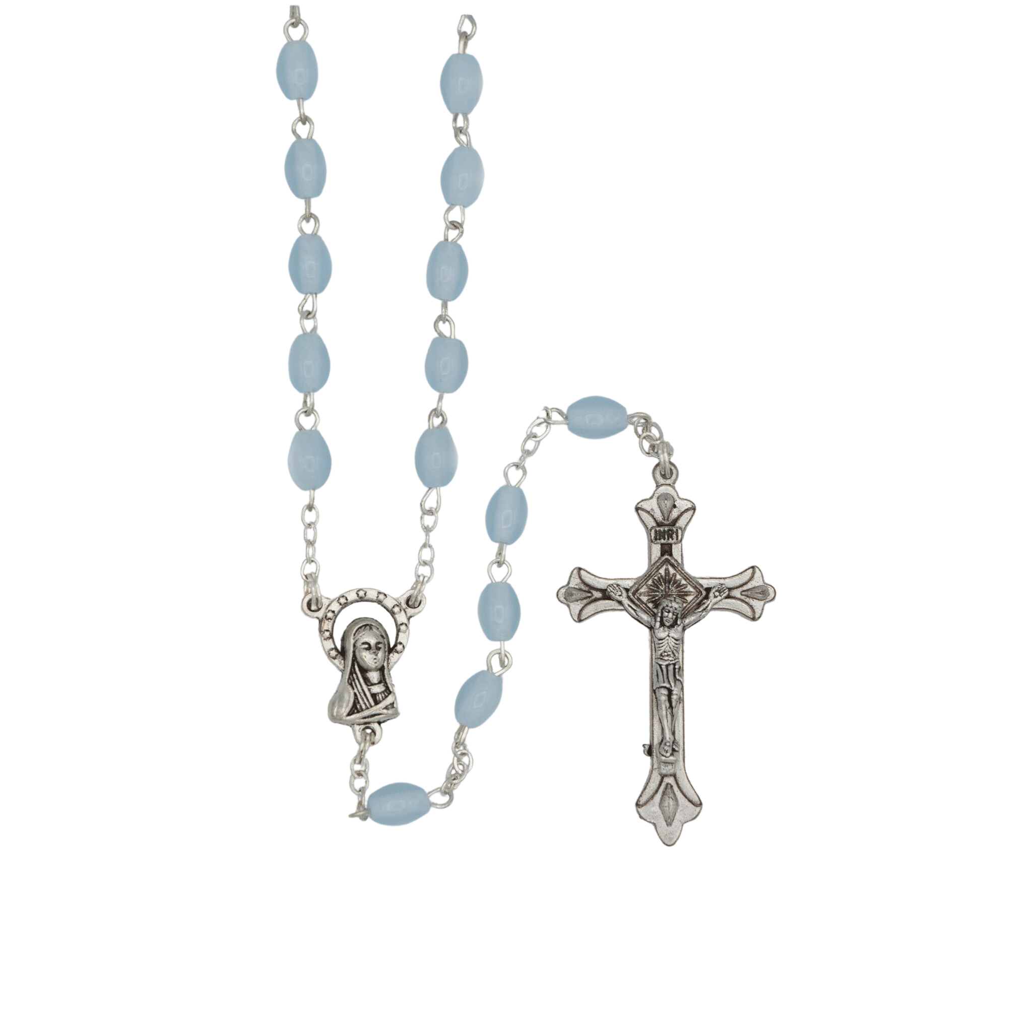 Deluxe Rosary, Crystal Blue 5mm Glass Beads with 20" Silver Linked Chain