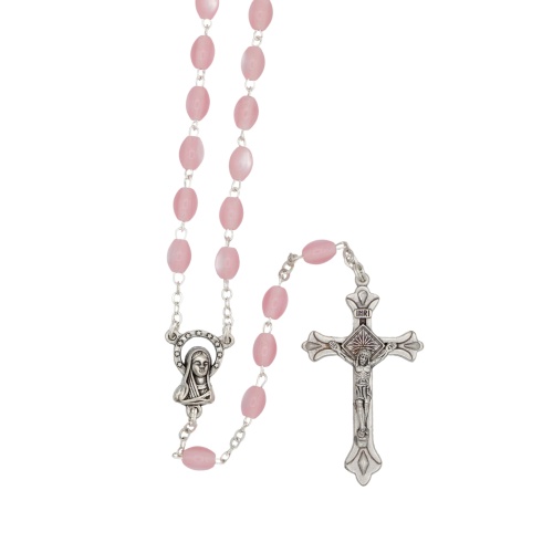Deluxe Rosary, Pink 5mm Glass Beads with 20" Silver Linked Chain